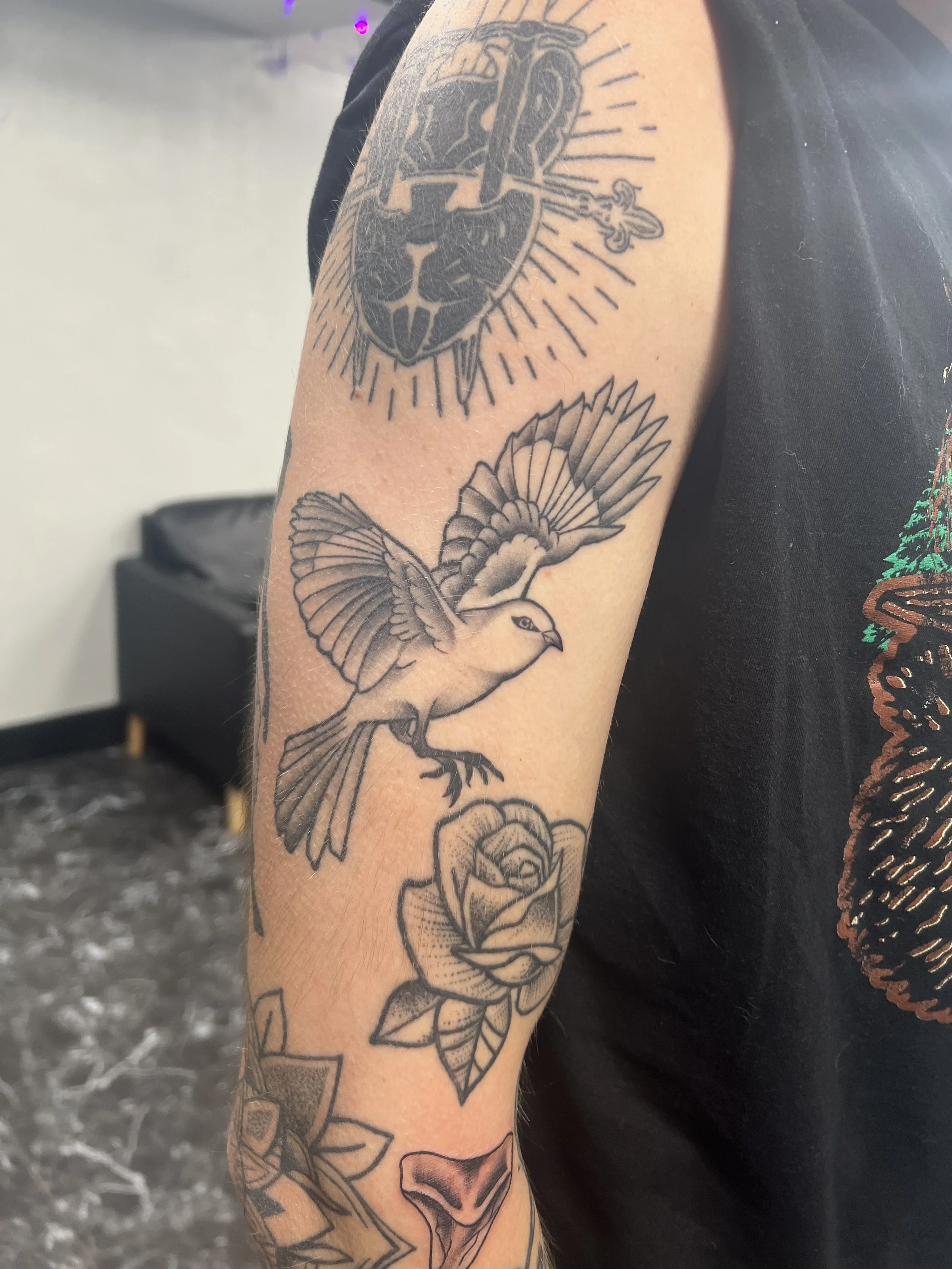 Black and grey tattoos are sleek and classic. I love the bold lines and peppered shading in traditional pieces, and have the most fun with black and grey realism. Black and grey is versatile; encompassing several styles to choose from. Take a look my portfolio to see more examples of how dynamic black and grey can be.